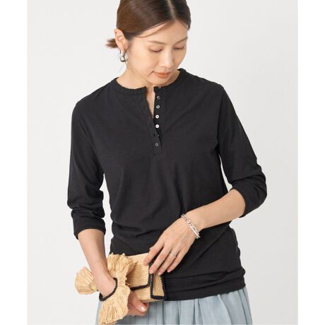 柔らかくドライな肌触りが特徴の強撚天竺を使用した、ベーシックなヘンリーネックのTシャツ。