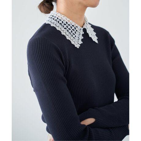 またホールガーメントで無縫製なので着心地がよく、レース衿は取り外し可能ですので外してベーシックなリブニットとしてもお使いいただけます。