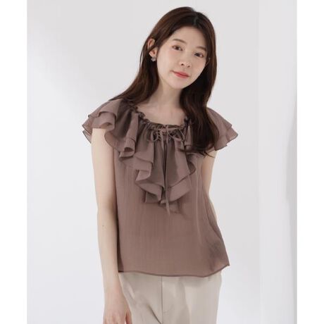 フロントの華奢なリボンやラッフルが映えるブラウスです。顔まわりを華やかに見せてくれる、程よいボリュームのラッフルがフェミニンな印象をプラス。大人にぴったりな落ち着いたカラーが、デイリーに活躍してくれます。