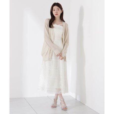 パネル調の刺しゅうがあしらわれたシアー生地が、品よく目を引くキャミワンピースです。襟元の紐とバックスタイルの華奢なリボンが新鮮に映るデザイン。太めの肩紐や体のラインを拾いすぎないオリジナルパターンが生地とマッチし、上品な印象に見せてくれます。