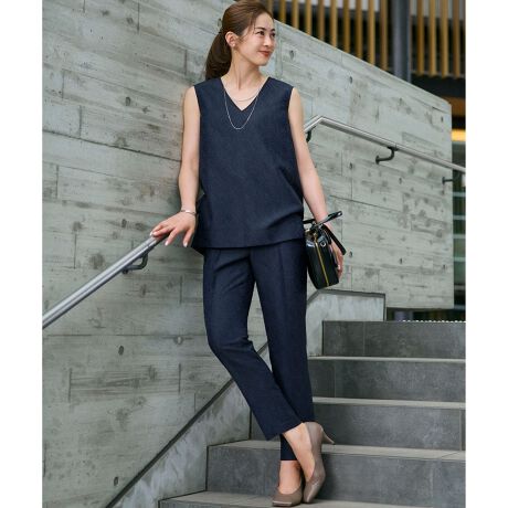 深めのVネックブラウスとすっきりとした細身のテーパードパンツがセットになった商品です。華やかなシーンにも着用いただけるアイテムです。それぞれ単品でカジュアルアイテムとの着回しもお楽しみいただけます。パンツのセンタープレスには折り目が取れにくい特殊な加工を施しています。適度なハリ感で肌離れがよく、手洗い可能な盛夏のセットアップです。カラーは、上品で洗練された印象のグレージュ(#002)、知的な気品が漂うネイビー(#075)の2色展開です。