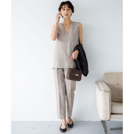 深めのVネックブラウスとすっきりとした細身のテーパードパンツがセットになった商品です。華やかなシーンにも着用いただけるアイテムです。それぞれ単品でカジュアルアイテムとの着回しもお楽しみいただけます。パンツのセンタープレスには折り目が取れにくい特殊な加工を施しています。適度なハリ感で肌離れがよく、手洗い可能な盛夏のセットアップです。カラーは、上品で洗練された印象のグレージュ(#002)、知的な気品が漂うネイビー(#075)の2色展開です。