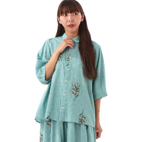 [型番:34150253]ミモザとドットが絶妙に調和された刺繍が爽やかなブラウス。シンプルなシャツカラーながら、コクーンスリーブなどディテールにこだわった1枚。オリジナルカラーのシャンブレー生地は、コットンと麻の軽やかな質感が特徴の素材に仕上げました。後ろ中心にボックスプリーツがアクセントになっています。同素材のパンツとのセットアップコーディネートもおすすめです。お手入れ:手洗い店舗へお問い合わせの際は、下記の品番をお申し付け下さい。[品番:34150253]