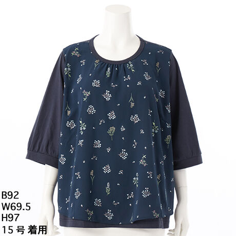 エステルシフォンに、ぷっくりと立体感のあるお花柄をプリントした華やかなコンビカットソー。