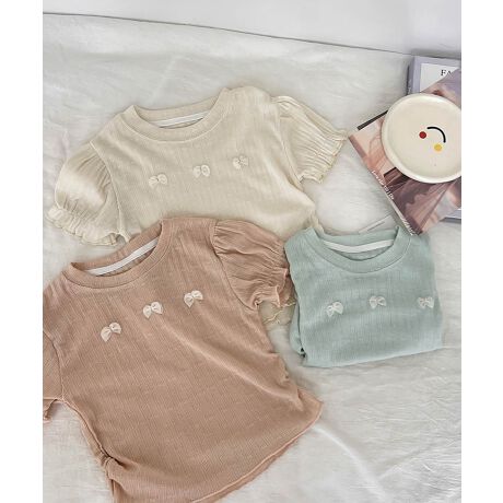 フロントに小さなリボンがあしらわれた、ガーリーなTシャツ。