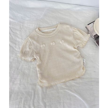 フロントに小さなリボンがあしらわれた、ガーリーなTシャツ。
