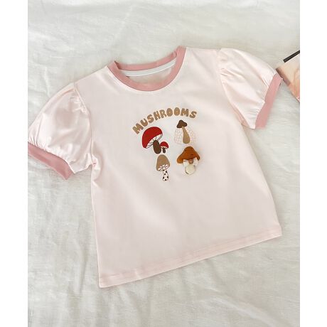ユニークなきのこのプリントが目を引く、遊び心あふれるTシャツ。コントラストカラーのリブデザインがアクセントになり、ナチュラルな雰囲気に。ふんわりとしたパフスリーブが可愛らしさをプラスし、カジュアルながらもおしゃれな印象に。