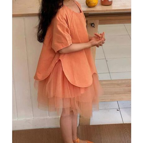 ふんわりと広がるチュールスカートが特徴のワンピース。トップ部分はシンプルながらも、スカート部分の柔らかなチュールで可愛らしさUP。異素材の組み合わせがアクセントになり、ナチュラルでガーリーな雰囲気に。ゆったりとしたシルエットで、お子様が動きやすく快適に過ごせるデザイン。