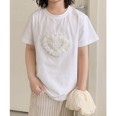 繊細なレース刺繍と立体フラワーモチーフの刺繍が胸元にあしらわれた、上品でフェミニンなキッズTシャツ。ハート型に配置された刺繍は、角度によって立体感が際立ち、シンプルなデザインの中にも華やかさを感じさせます。