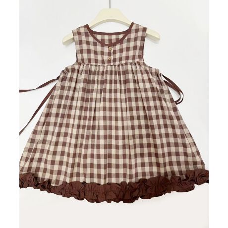 クラシックなチェック柄が可愛いノースリーブワンピース。裾にはさりげないフリルをあしらい、両サイドのリボンがアクセントに。ふんわり広がるシルエットで、涼しく快適な着心地です。