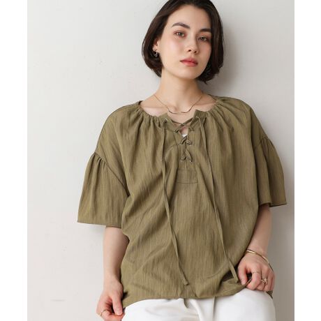 トレンドのレースアップデザインが、フェミニンな印象をプラス。紐の結び方で、Vネックの深さを調整できます。スキッパーのデザインなので顔周りをすっきりと見せてくれます。着丈が長めのゆったりシルエットなので、気になる腰回りもカバーしてくれるのも嬉しいポイント♪