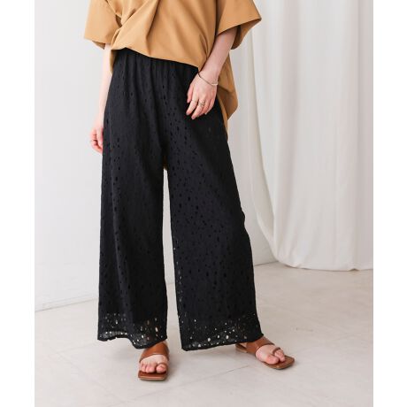 フラワー柄のレースが上品なワイドパンツです。ウエストはゴム仕様になっており、履きやすく快適です。ストレッチのきいた裏地がついているので動きやすく、夏のデイリーコーデに活躍します。きれいめに見えるので、オフィスカジュアルとしても◎