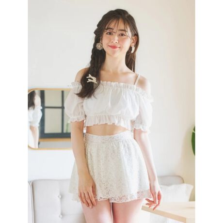 ぽわんとしたオフショルビキニに愛らしい総レースデザインのキュロットパンツを合わせた3点セット。