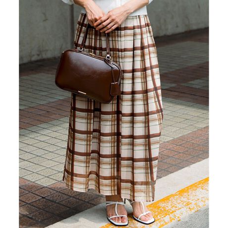 手書き風のチェックプリントによるギャザースカート。透け感のあるシアー素材にギャザーをつけることで、生地の分量がありながらもごわつかず、軽快に着用していただけます。配色の切り替えデザインになっているウエスト部分は、ゴム仕様ですが前側はすっきりとフラットに仕上げることで、トップスの裾をインしてもきちんとした着こなしが可能です。カラーはトレンドカラーのブラウンチェック(#335)、清涼感のあるブルーチェック(#374)の2色展開です。