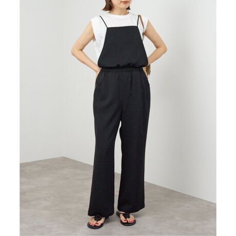 滑らかな落ち感とさりげない光沢が美しい、ストレッチ性のあるツイル素材を使用したオールインワン。