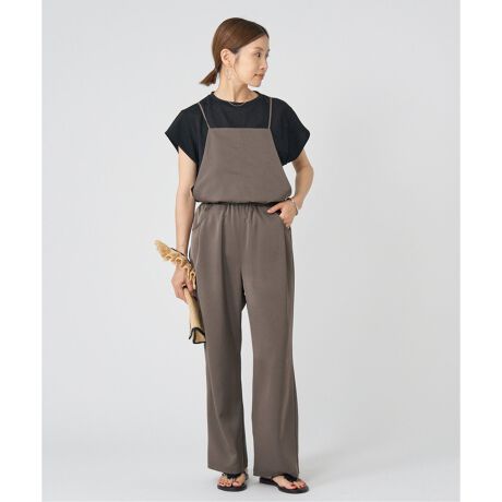 滑らかな落ち感とさりげない光沢が美しい、ストレッチ性のあるツイル素材を使用したオールインワン。