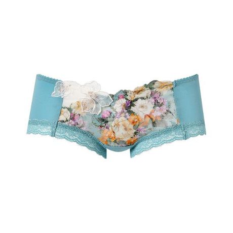 ●はきごこちがよい バックはやわらかく伸びるナイロンベア天竺素材で、はきごこちがよい・レースとアップリケにはラメ糸を使用「リボンブラ 胸もとフィットながもち (BXB490)」とペアコーデが楽しめるボーイレングスショーツ。ローライズデニムなどとコーディネイトしやすいのもポイント。ラナンキュラスの花を描いたアップリケが晴れやかな魅力を放つデザインです。