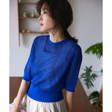 メッシュ編地の5分袖カーデは長い夏のブラッシュアップアイテム