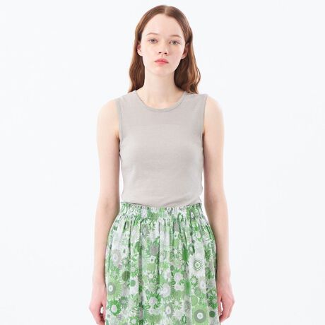 ほどよい光沢のラメ素材を使用したベーシックなタンクトップ。