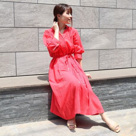 シボ感が夏らしく肌離れのよい素材でドルマンスリーブのワンピースを仕立てました。