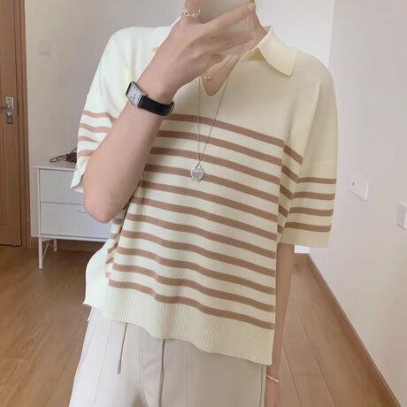 カジュアルながらも上品な印象を与える、ボーダーニットポロシャツ。