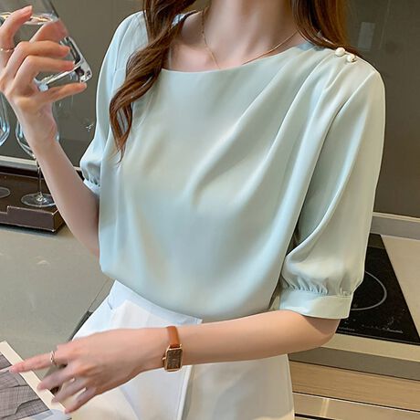 デコルテラインを美しく見せるアシメトリーなVネックデザインが、上品な女性らしさを演出するシフォンブラウス。