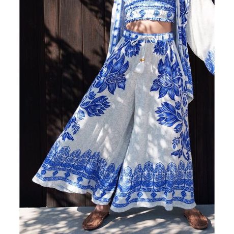 レーヨン素材ならではの落ち感と表面感が魅力的なパンツ。トルコのタイルから着想を得たオリエンタルなロータス柄デザイン。ワイドパンツでどんなトップスを合わせても決まる一押しアイテム。嬉しいサイドポケット付き。