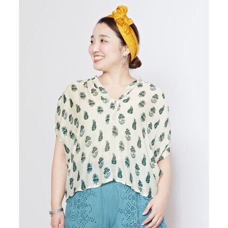 [型番:IKH-5202-2025]インド、ジャイプールの伝統技法から生まれたバグルー柄を模したスクリーンプリントトップス。光沢感のあるキュプラレーヨン素材で、思わず着たくなるとろみのある肌触り。ゆったりとしたワイドシルエット。