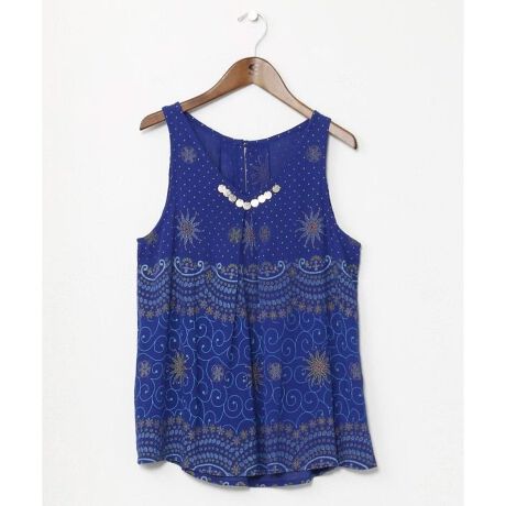 ステンドグラスの柄から着想をしたデザインのノースリーブトップス。胸元のコインがチャームポイント。胸元のタックがすっきりとした印象を与える。シンプルになりがちないつものコーディネートにプラスすると華やかに。生地はレーヨンクレープで、軽く涼しい。