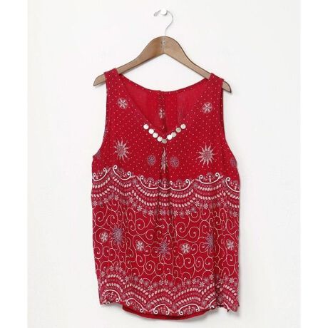 ステンドグラスの柄から着想をしたデザインのノースリーブトップス。胸元のコインがチャームポイント。胸元のタックがすっきりとした印象を与える。シンプルになりがちないつものコーディネートにプラスすると華やかに。生地はレーヨンクレープで、軽く涼しい。