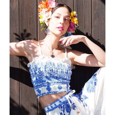 トルコのタイルから着想を得たオリエンタルな植物柄デザインのチューブトップ。肩紐を付けるとキャミソールに、肩紐を外せばチューブトップとしても着用できる2WAYタイプ。ゴムシャーリングのため体型を選ばず楽しむことが出来る。
