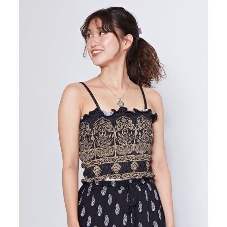 トルコのタイルから着想を得たオリエンタルな植物柄デザインのチューブトップ。肩紐を付けるとキャミソールに、肩紐を外せばチューブトップとしても着用できる2WAYタイプ。ゴムシャーリングのため体型を選ばず楽しむことが出来る。
