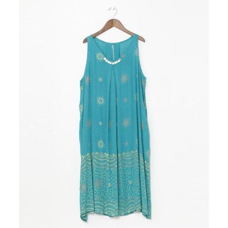 ステンドグラスの柄から着想を得たデザインのノースリーブワンピース。鮮やかな色展開はステンドグラスをイメージ。胸元のコインがチャームポイント。胸元のタックでシルエットがスッキリ。生地はレーヨンクレープを使用しており、軽く涼しい。