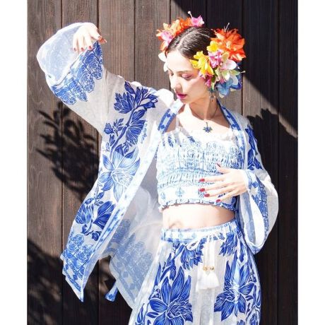 レーヨン素材ならではの落ち感と表面感が魅力的な、UVカット加工のカーディガン。トルコのタイルから着想を得たオリエンタルなロータス柄デザイン。ワイドな袖とベルト付きで気分によって動きをプラスできる。便利な内ポケット付き。