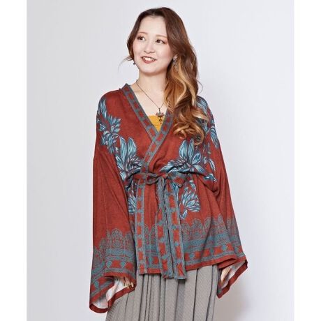 レーヨン素材ならではの落ち感と表面感が魅力的な、UVカット加工のカーディガン。トルコのタイルから着想を得たオリエンタルなロータス柄デザイン。ワイドな袖とベルト付きで気分によって動きをプラスできる。便利な内ポケット付き。