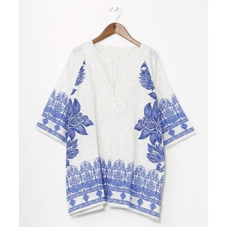 [型番:IAC-5227-2025]着心地の良いインド綿のメンズトップス。トルコのタイルから着想を得たオリエンタルなロータス柄デザイン。スッキリとした首回りとビッグシルエットでゆったり着用できる。嬉しいサイドポケット付き。