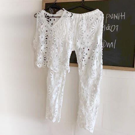 クロシェ編みのタンクトップとストレートパンツのセットアップ。<br>
