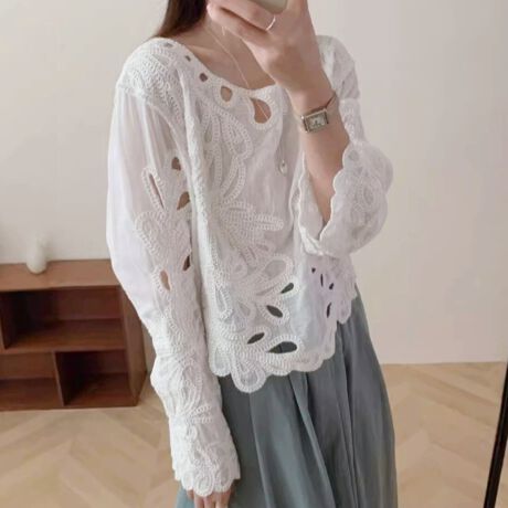 女性らしさ引き立つ長袖クロシェ編みトップス