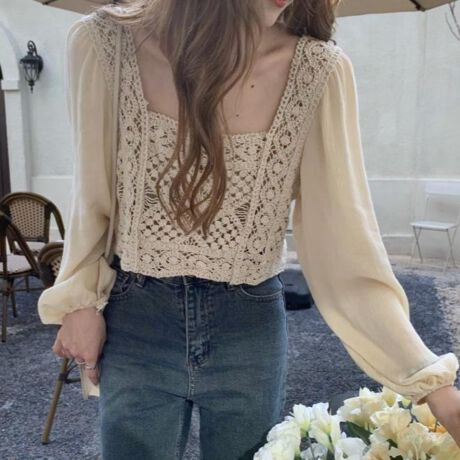 軽やかなパフスリーブ長袖スクエアネックトップス