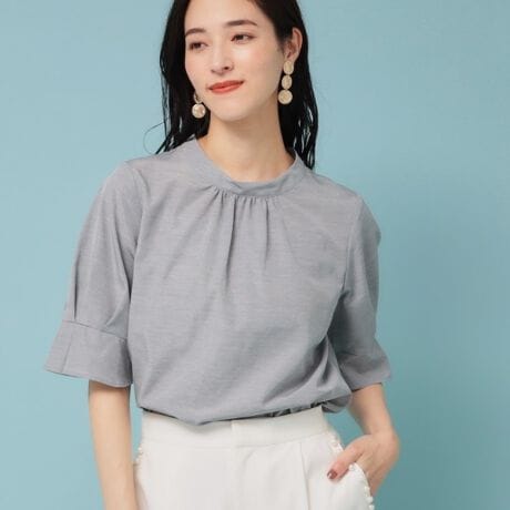 衿元に施したフワッとしたギャザーがポイントのスタンドネックブラウス。