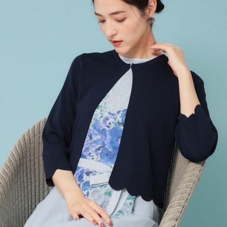 ボレロ風のカーディガンは、裾にスカラップデザインを施し、エレガントさと遊び心をプラス。