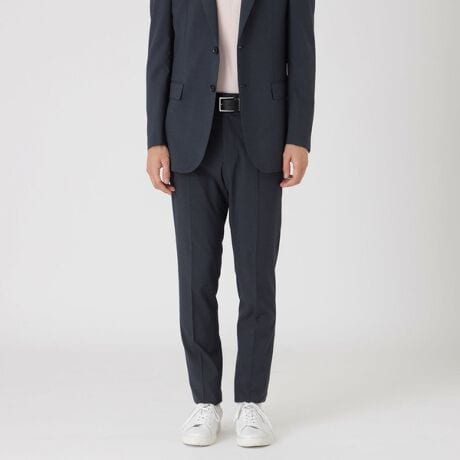 膝裏の裏地を省くことで、湿気の多い日でも体にまとわりつく現象を軽減し、快適にご着用頂けます。ウェストサイド部分にゴムシャーリングを施す事で、シャープな雰囲気を維持しながらも履き心地を追求したデザインです。洗濯機での洗濯が可能で、スーパークリース加工を施しているため、クリースラインが取れにくいイージーケアアイテムです。