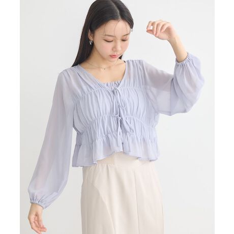 シアー素材のシャーリングブラウスとキャミソールを合わせたアンサンブル。ふんわりエアリーな素材感とギャザーを施した立体的なシルエットが女性らしいデザインです。軽やかな着心地のトップスは夏の羽織アイテムにも最適。セットアレンジはもちろん、それぞれ単品使いもお楽しみいただけます。透け感[あり]