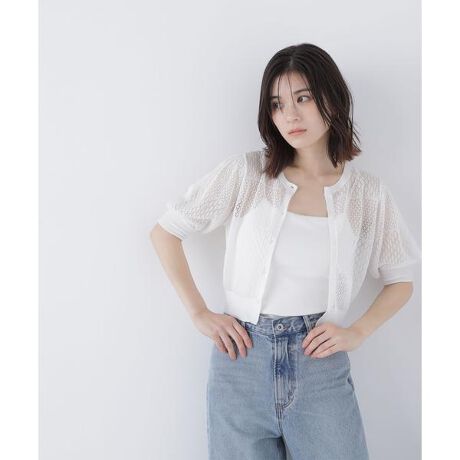 トレンド感のある華奢なレース編みで編み立てたハーフスリーブのニットカーディガン。袖山にギャザーを入れたパフスリーブで、フェミニンな雰囲気に仕上げています。フロントはダイヤモンドカットしたクリア釦をきらっとアクセントに。単品使いでデニムと合わせてカジュアルダウンしたり、同素材のスカートを揃えてSETUPとしても着ていただけます。<素材>程よい光沢感のある華奢な糸を使用して、レース編みで編み立てています。<詳細>仕様・前ボタン裏地・なし透け感・あり / 光沢・ややあり / 伸縮性・あり生地の厚さ・薄手<シリーズ>■スカート[品番:0175227740]※モデルの着用画像の場合、光の当たり具合により、実際の色味と異なって見えることがございます。色味は、商品単体の画像をご参照ください。