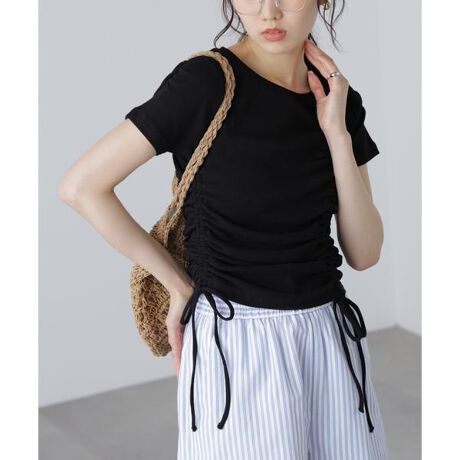 程よい肉感のリブカットソー素材を使ったデザインTシャツ。肩から裾にかけてカーブを付けたドロストデザインは、立体感があり目を引きます。ドロストは長さ調整ができ、短丈にすることも可能。前後で同じドロストデザインと、袖山にもギャザーを寄せているので、どこから見ても可愛い1枚。コンパクトながらディテールが映えるので、デニムなど、ワイドシルエットのボトムス合わせがおすすめです。※モデルの着用画像の場合、光の当たり具合により、実際の色味と異なって見えることがございます。色味は、商品単体の画像をご参照ください。