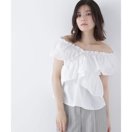ギャザーを寄せたフリルを身頃でクロスした華やかなブラウス。内側のフリル端には細ゴムを通しているので、Vネックブラウスとしても、肩を下げてオフショルダーとしても着られる2wayデザイン。着丈は、INもOUTもしやすいショート丈です。デニムやパンツ合わせは、裾をOUTしてラフに着たり、ナロースカートを合わせてタックインすると、すっきりとした着こなしが叶います。<素材>カジュアルな雰囲気をもつ、ハリ感のある素材を使用しています。<詳細>仕様・開閉なし裏地・なし透け感・なし / 光沢・なし / 伸縮性・なし生地の厚さ・普通※モデルの着用画像の場合、光の当たり具合により、実際の色味と異なって見えることがございます。色味は、商品単体の画像をご参照ください。