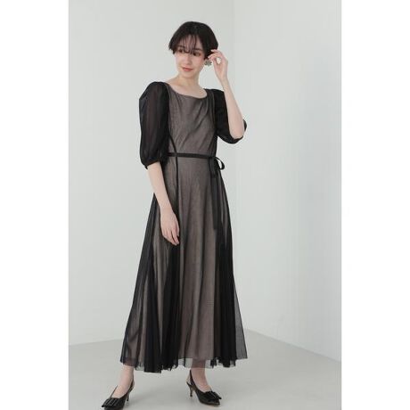 大胆なパフスリーブと背中開き、ボリュームのある裾が美しいドレス繊細なドットチュールと、華奢なラッセルレースの異なる素材で仕立てた2展開のドレス。やや伸縮性があるので、ボディに美しくフィットしてくれます。付属のシルクリボンでウエストマークが可能。裏地にはベージュを使用し、インナーカラーがヴィンテージライクに映える1着です。※チュールは繊細な素材のため、引っ掛かりにはご注意ください。