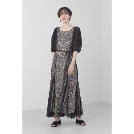 大胆なパフスリーブと背中開き、ボリュームのある裾が美しいドレス繊細なドットチュールと、華奢なラッセルレースの異なる素材で仕立てた2展開のドレス。やや伸縮性があるので、ボディに美しくフィットしてくれます。付属のシルクリボンでウエストマークが可能。裏地にはベージュを使用し、インナーカラーがヴィンテージライクに映える1着です。※チュールは繊細な素材のため、引っ掛かりにはご注意ください。