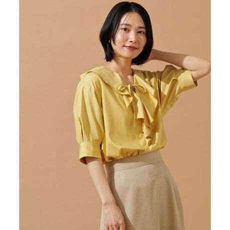 トレンド感のあるラッフルデザインのブラウスは、デイリーにもオフシーンにもオススメ。襟元のリボンは結んだり、ひとまきして垂らすなど、その日の気分やボトムスに合わせてアレンジできます。長いシーズン着用できる5分袖は、涼しくなる季節からはジャケットを羽織り、襟からラッフルを出して着こなすのもおすすめです。<素材>程よい落ち感とハリ感があり、シャツ生地のように見える合繊素材を使用しています。<詳細>仕様・前リボン裏地・なし透け感・なし / 光沢・なし / 伸縮性・なし 生地の厚さ・普通※モデルの着用画像の場合、光の当たり具合により、実際の色味と異なって見えることがございます。色味は、商品単体の画像をご参照ください。