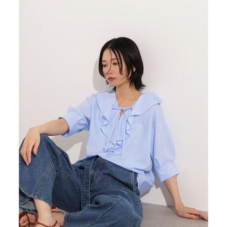 トレンド感のあるラッフルデザインのブラウスは、デイリーにもオフシーンにもオススメ。襟元のリボンは結んだり、ひとまきして垂らすなど、その日の気分やボトムスに合わせてアレンジできます。長いシーズン着用できる5分袖は、涼しくなる季節からはジャケットを羽織り、襟からラッフルを出して着こなすのもおすすめです。<素材>程よい落ち感とハリ感があり、シャツ生地のように見える合繊素材を使用しています。<詳細>仕様・前リボン裏地・なし透け感・なし / 光沢・なし / 伸縮性・なし 生地の厚さ・普通※モデルの着用画像の場合、光の当たり具合により、実際の色味と異なって見えることがございます。色味は、商品単体の画像をご参照ください。